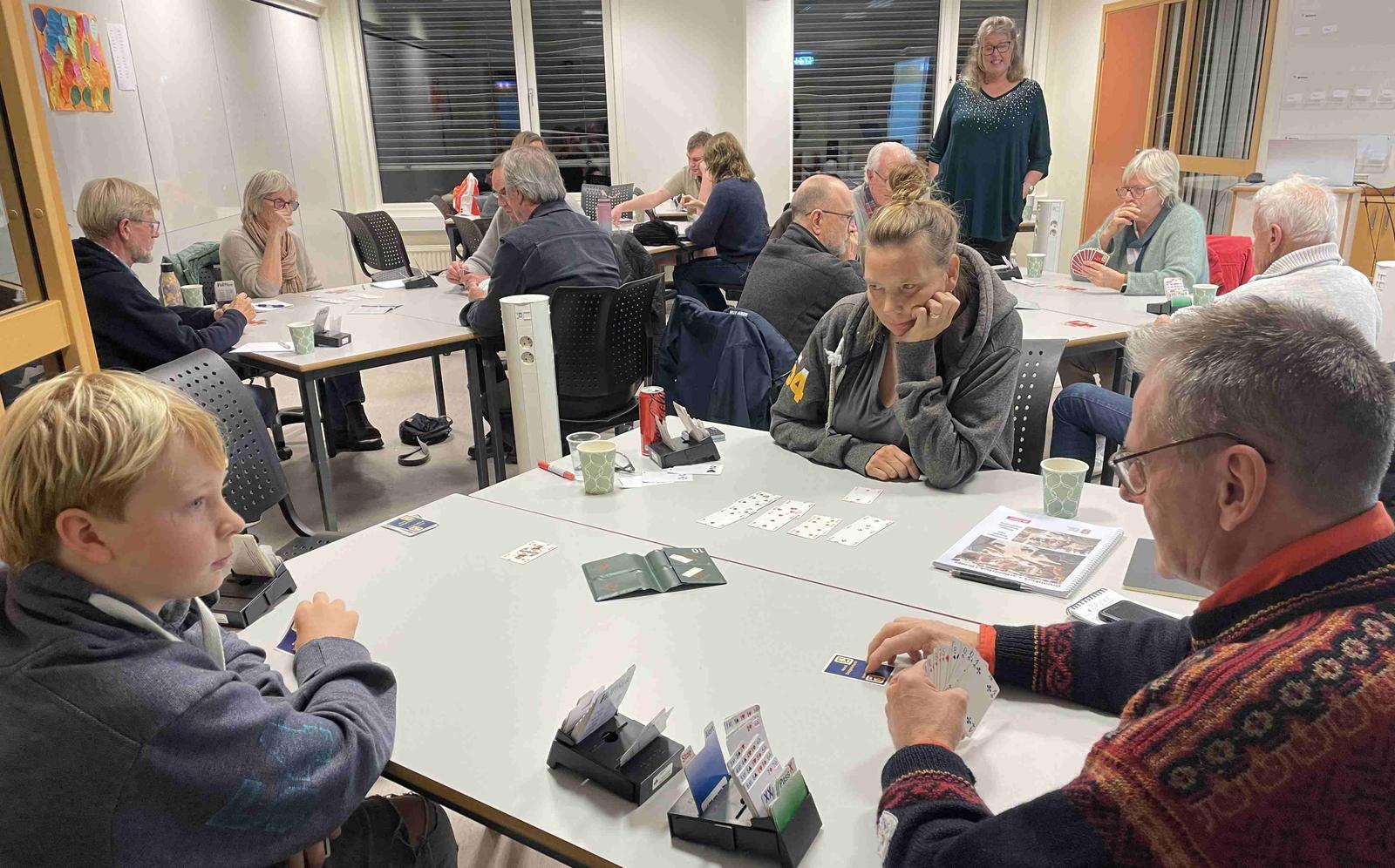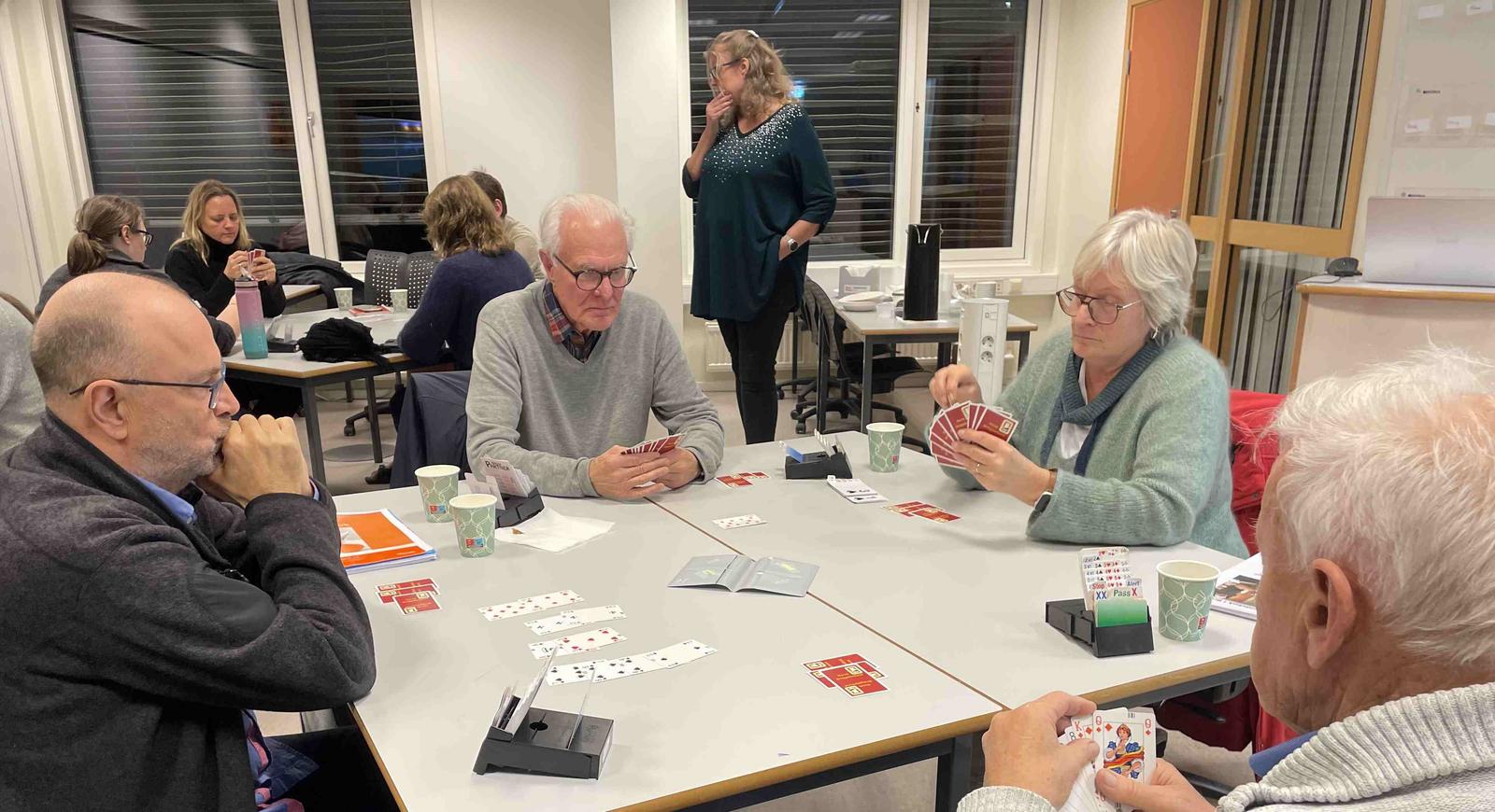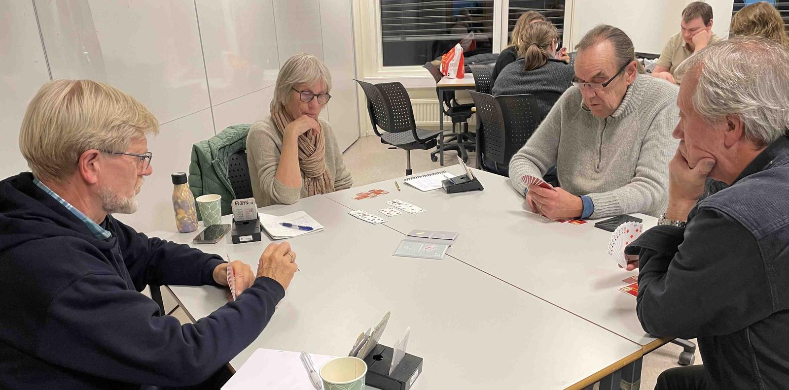 Fire fulle bord var på kurs med Elisabeth Sjødal sist onsdag 12/11 for å lære mer om god spilleføring. Planlegg spillet – tell sikre stikk, og legg en strategi for hvordan du skal få resten av stikkene for å få hjem kontrakten – var Elisabeths klare råd. Og så viste hun hvordan.